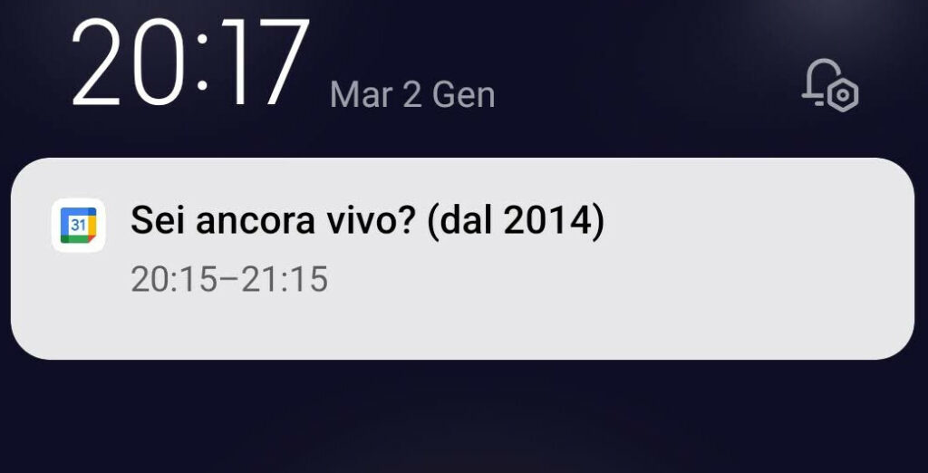 Il 2 gennaio, verso le otto e un quarto di sera, sul telefono mi è comparsa questa notifica del calendario di Google: